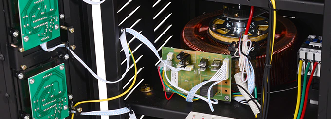 В отличие от релейных моделей стабилизатор использует электромеханический принцип стабилизации с подвижным угольным контактом, скользящим по обмотке автотрансформатора. Оборудование обеспечивает высокую точность выходного напряжения — 2% даже при значительных колебаниях в сети.