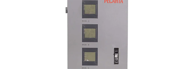 Лицевая панель оборудована тремя ЖК-дисплеями, позволяющими контролировать ток и входное/выходное напряжение для каждой фазы. Устройство имеет защиту от короткого замыкания, перегрева, повышенного напряжения. Фильтры импульсных помех исключают риск искажения сигнала, обеспечивая чистую синусоиду на выходе. При достижении критической температуры включается принудительная вентиляция для охлаждения внутренних компонентов. Стабилизатор РЕСАНТА АСН-15000/3-Ц электронного типа работает практически бесшумно, не мешая окружающим.
